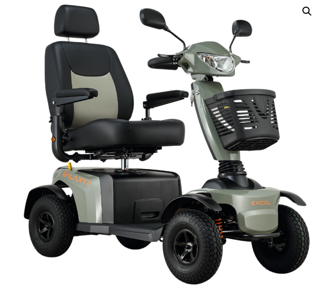 Introducing the new Excel Galaxy II scooter, available in 5 colours, the Galaxy II is the definition of modern. With a new multifunction LCD display screen, angle adjustable steering column, swivel chair and maximum speed of 8 mph, this maxi size road scooter is ideal for an active user. With a mile range varying between 25 – 35 miles, you can explore in ultimate comfort and style, handling all terrains including gravel, grass, pavements and bumpy roads.